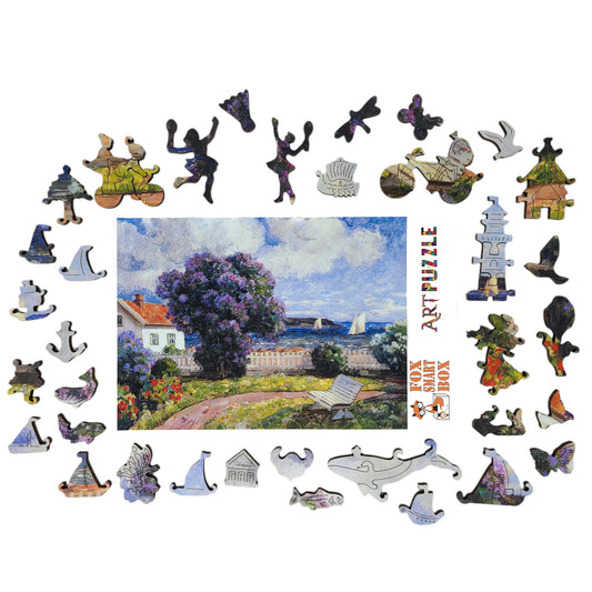 Large Format Wooden Jigsaw Puzzle with Uniquely Shaped Pieces for Seniors and Adults - 215 Pieces - Coast landscape with blossoming lilac bush