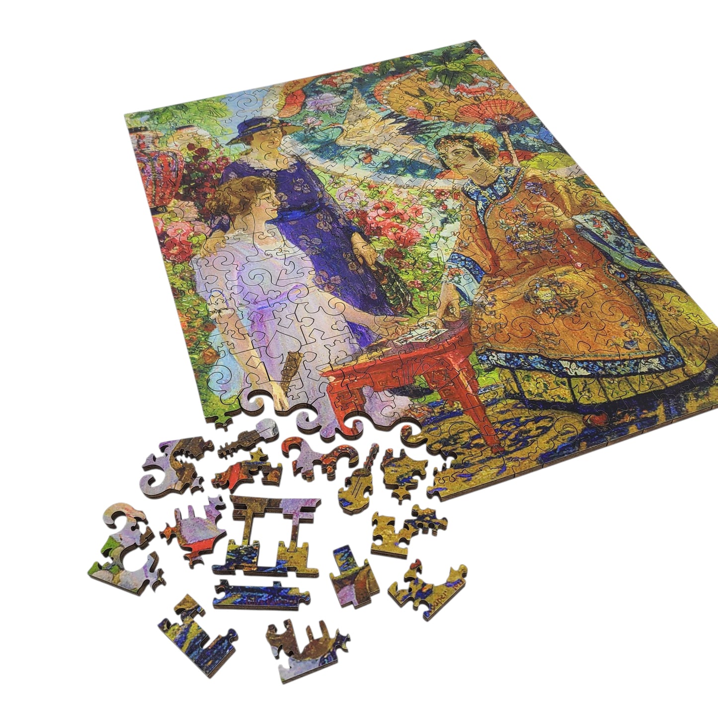 Sophisticated elements, cut with a high-precision laser, seamlessly slide together into colorful art, making it oddly satisfying to put a wooden piece in place. Each puzzle contains dozens of hand-drawn, uniquely shaped pieces, called "whimsies". Whimsies are designed by artists and crafted to match the puzzle's theme and tell a story. The intricately cut wooden puzzle will challenge a puzzler and provide hours of enjoyment.