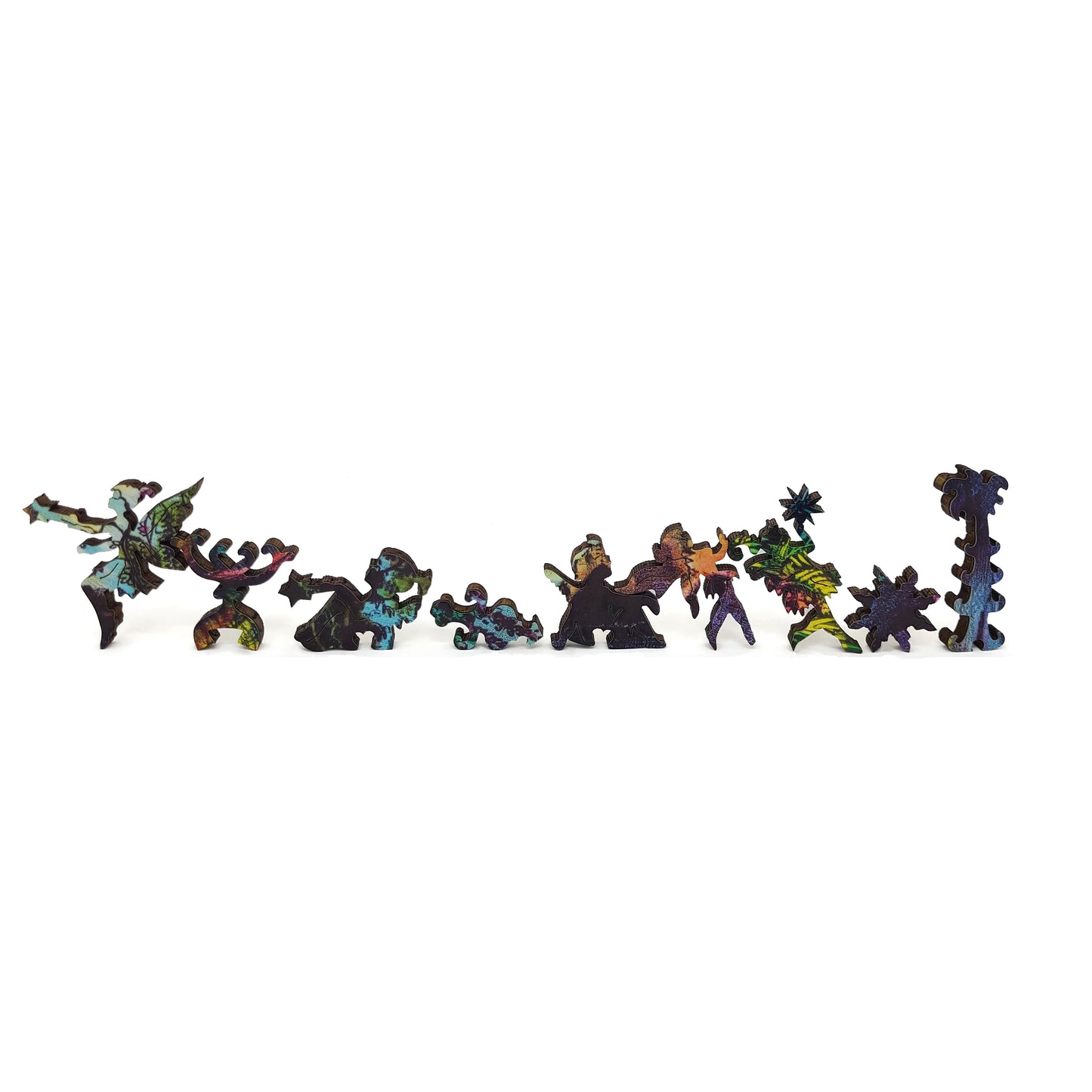 Elementos sofisticados, cortados con un láser de alta precisión, se deslizan sin problemas en un arte colorido, lo que hace que sea extrañamente satisfactorio colocar una pieza de madera en su lugar. Cada rompecabezas contiene docenas de piezas de formas únicas dibujadas a mano, llamadas "caprichos". Los caprichos están diseñados por artistas y elaborados para coincidir con el tema del rompecabezas y contar una historia. El rompecabezas de madera intrincadamente cortado desafiará al rompecabezas y le brindará horas de diversión.