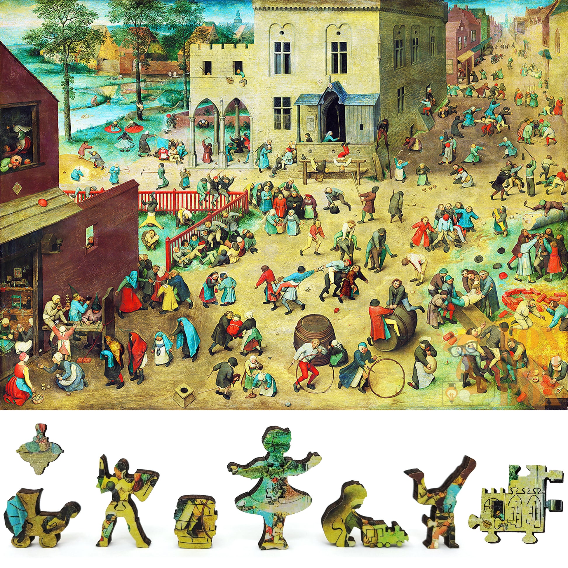 🎨 Children’s Games depicts a bustling town square filled with more than 200 children engaged in dozens of different games. The scene turns play into a catalogue of human behavior—spinning tops, mock weddings, racing, climbing, and pretend battles unfold simultaneously. Bruegel transforms childhood amusement into a reflection on society itself, where human activity becomes cyclical, patterned, and endlessly repeated.