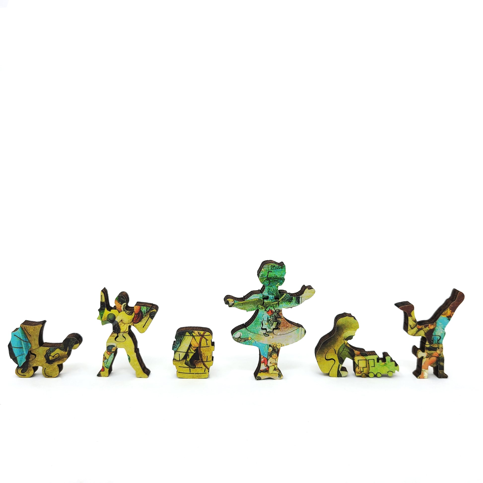 Sophisticated elements, cut with a high-precision laser, seamlessly slide together into colorful art, making it oddly satisfying to put a wooden piece in place. Each jigsaw puzzle contains dozens of hand-drawn, uniquely shaped pieces, called "whimsies". Whimsies are designed by artists and crafted to match the puzzle's theme and tell a story. The intricately cut wooden puzzle will challenge a puzzler and provide hours of enjoyment.