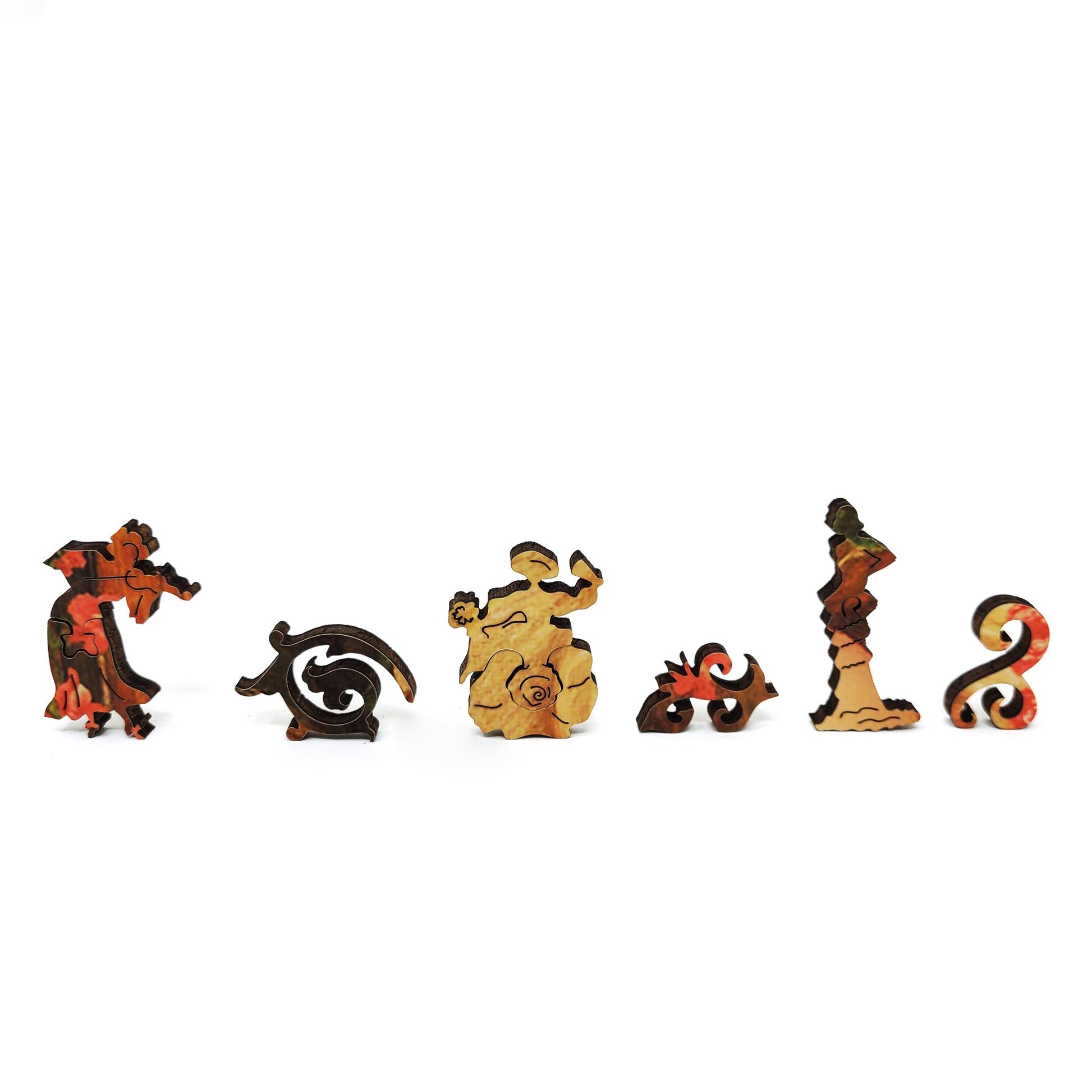 Sophisticated elements, cut with a high-precision laser, seamlessly slide together into colorful art, making it oddly satisfying to put a wooden piece in place. Each jigsaw puzzle contains dozens of hand-drawn, uniquely shaped pieces, called "whimsies". Whimsies are designed by artists and crafted to match the puzzle's theme and tell a story. The intricately cut wooden puzzle will challenge a puzzler and provide hours of enjoyment.